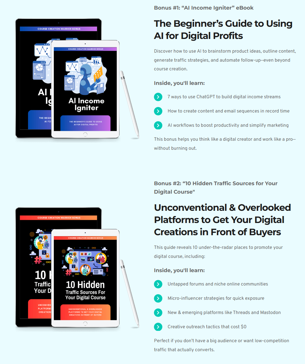 You get full access to the 14-day Course Creation Warrior training, all done-for-you AI prompts, sales page and copywriting guidance, the $32,383 launch blueprint, and two exclusive bonuses. It’s a complete system to create and sell your course—risk-free.
