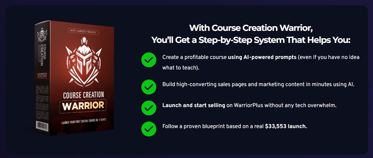 Course Creation Warrior is a guided 14-day training system that walks you from idea → course content → sales page → launch. The big promise is speed: use AI prompts + a daily checklist so you don’t get stuck on writing, structure, or marketing materials.